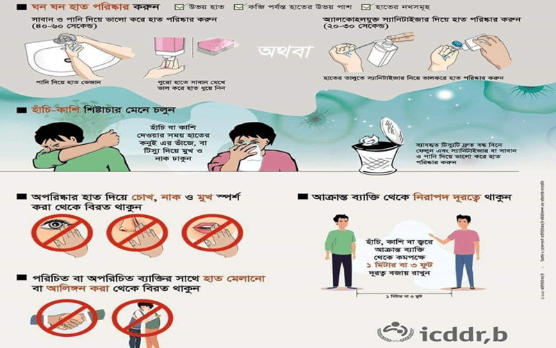 চীনের উহান শহর থেকে ইতিমধ্যেই বিশ্বের ৯৪টি দেশে ছড়িয়ে পড়েছে এই ভাইরাস। মারা গেছে ১৬টি দেশের সাড়ে ৩ হাজারেরও বেশি মানুষ। আক্রান্ত হয়েছে প্রায় ১ লাখ ৭ হাজার মানুষ। এমন পরিস্থিতিতে করোনাভাইরাস ছড়িয়ে পড়া ঠেকাতে কিছু পরামর্শ মেনে চলার কথা বলেছে আইসিডিডিআরবি। লেখচিত্রে এই নির্দেশনাগুলো প্রকাশ করেছে সংস্থাটি। ওই সচিত্র নিদের্শনায় বলা হয়…