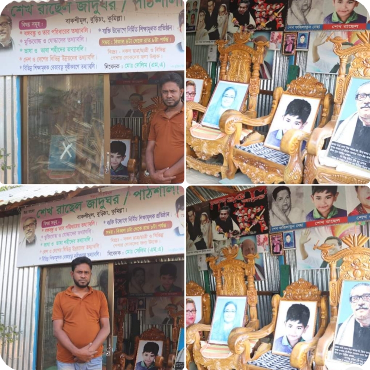 আসছে ১৭ই মার্চ বঙ্গবন্ধুর জন্মশতবর্ষ। বঙ্গবন্ধু শেখ মুজিবুর রহমানের প্রতি শ্রদ্ধা জানিয়ে কুমিল্লা জেলার বুড়িচং উপজেলার বাকশীমূল গ্রামের মো: সেলিম গত ২ বছর আগে শুরু করেন চেয়ার তৈরির কাজ। প্রায় ৩ লাখ টাকা ব্যয় করে চারটি চেয়ার বানিয়ে নিজে না বসে জাতির জনক বঙ্গবন্ধু শেখ মুজিবুর রহমান ও তার কন্যা শেখ হাসিনার, শেখ রাসেল এবং শেখ রেহেনা এর ছবি রাখতে দেখা যায় এবং ছবি রাখার জন্য একটি ঘরও বানানো হয়। শুধু ঘর বানিয়ে থেমে যান নি। বঙ্গবন্ধুর ও তার পরিবারের তথ্যবলি, মুক্তিযুদ্ধ ও মুক্তিযদ্ধাদের তথ্যাবলি, ভাষা ও ভাষা শহিদের তথ্যাবলি, দেশ ও দেশের বিভিন্ন উন্নয়নের তথ্যাবলি, বিভিন্ন শিক্ষামূলক, বেকারত্ব দূরীকরণের তথ্যাবলি ও ইতিহাস জানাতে সেলিমের নিজ উদ্যোগ ও অর্থায়নে শেখ রাসেল জাদুঘর পাঠশালা স্থাপন করেন।
