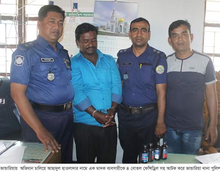পিরোজপুর জেলার ভান্ডারিয়া উপজেলার ৪ নং ইকড়ি ইউনিয়নে অভিযান চালিয়ে আছাদুল হাওলাদার (৩৫) নামে এক মাদক ব্যবসায়ী কে ৪ বোতল ফেন্সিড্রিল সহ আটক করেছে ভান্ডারিয়া থানা পুলিশ। ভান্ডারিয়া থানা সূত্রে জানা যায়, আজ ১৮ মার্চ বুধবার দুপুরে ১১৫ নং ইকড়ি সরকারি প্রাথমিক বিদ্যলয়ের সামনের সড়কে মাদক ক্রয় বিক্রয় হচ্ছে এমন গোপন সংবাদের ভিত্তিতে তেলিখালী তদন্ত কেন্দ্রের ইনসার্জ এস আই নুরুল আমিন এর নেতৃত্বে সঙ্গীয় ফোর্স এ এস আই ফোরকান এবং এ এস আই রুবেল অভিযান চালিয়ে আছাদুল হাওলাদারকে ৪ বোতল ফেন্সিড্রিল সহ আটক করে। মাদক ব্যবসায়ী আছাদুল হাওলাদার ইকড়ি গ্রামের আঃ ছালেক হাওলাদারের পুত্র ও ইউপি সদস্য জামাল হাওলাদার এর ভাই। অফিসার ইনচার্জ এস এম মাকসুদুর রহমান জানান, এ ঘটনায় আটককৃত ব্যক্তির বিরুদ্ধে মাদকদ্রব্য নিয়ন্ত্রণ আইনে একটি মামলা দায়ের করা হয়েছে।