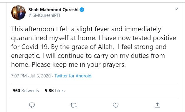 টুইটে মাহমুদ কোরেশি বলেন, দুপুরে আমি শরীরে একটু জ্বর অনুভব করি এবং সঙ্গে সঙ্গে নিজেকে কোয়ারেন্টাইনে নিয়ে যাই। টেস্ট করিয়ে জানতে পারলাম, করোনা পজিটিভ আমি। আল্লাহর রহমতে আমি এখনো নিজেকে কর্মশক্তিপূর্ণ ও শক্তিশালী অনুভব করছি।