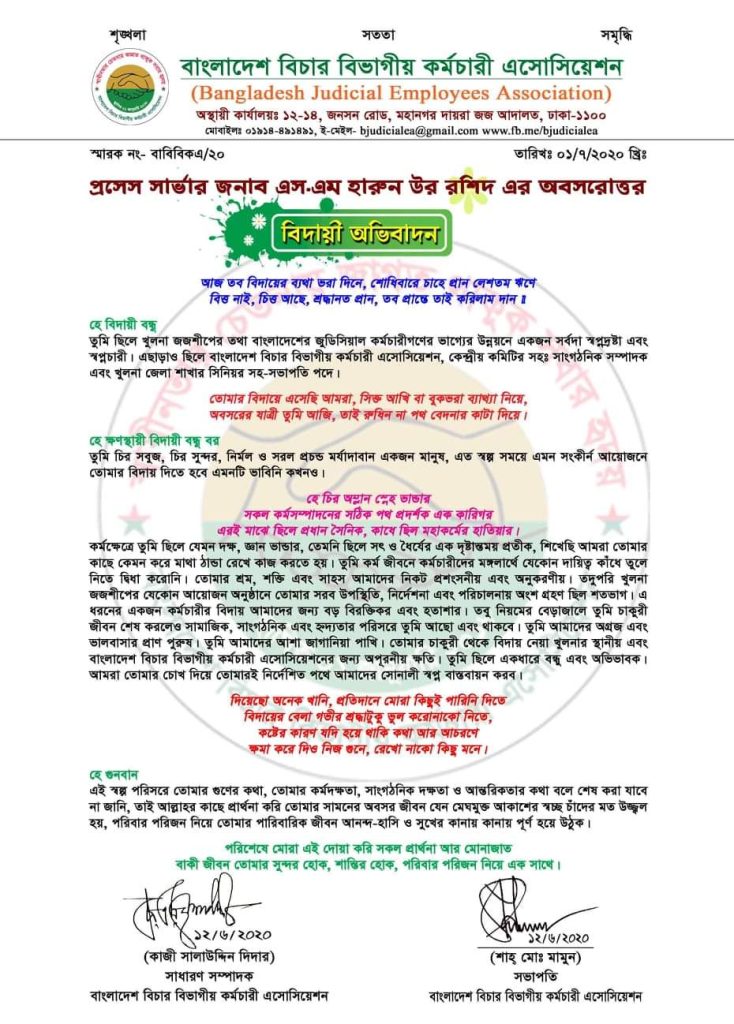 অবসরে চলে গেলেন খুলনা জেলা ও দায়রা জজ আদালতের কর্মচারী এবং বাংলাদেশ বিচার বিভাগীয় কর্মচারী এসোসিয়েশন (বাবিকএ) এর কেন্দ্রীয় কমিটির সহ-সাংগঠনিক সম্পাদক নং-১১, এবং খুলনা জেলা শাখার সিনিঃ সহঃ সভাপতি এস.এম. হারুন-উর-রশিদ। আজ (৮জুলাই) বুধবার সকাল ১১ টায় জেলা জজ আদালতের নাজিরখানায় এই বিদায়ী অনুষ্ঠানটি হয়। ১জুলাই থেকে তাঁর এই অবসর কাযর্কর হয়েছে। তবে আগামী এক বছর তিনি সবেতনে অবসর উত্তর ছুটিতে থাকবেন।