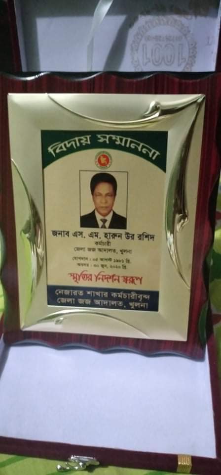 এস.এম.হারুন-উর-রশিদ এর অবসর বিদায়ী অনুষ্ঠানে প্রধান অতিথি হিসেবে উপস্থিত ছিলেন খুলনা জেলা জজ আদালতের প্রশাসনিক কর্মকর্তা মোঃ ইউনুস আলী, সভাপতি হিসেবে উপস্থিত ছিলেন আদালতের নেজারত শাখার নাজির মোঃ আব্দুস সাত্তার, বিশেষ অতিথী হিসাবে উপস্হিত ছিলেন খুলনা চীফ জুডিসিয়াল ম্যাজিষ্ট্রেট আদালতের নাজির মোঃ তরিকুল ইসলাম, সেরেস্তাদার মোঃ রবিউল আলম, এ,কে,এম, জাকারিয়া, ষ্টেনো গ্রাফার মোঃ আশরাফ আলী, দায়রা সহকারী সেখ মো রিপন সহ আদালতের বিভিন্ন স্তরের কর্মচারীবৃন্দ।