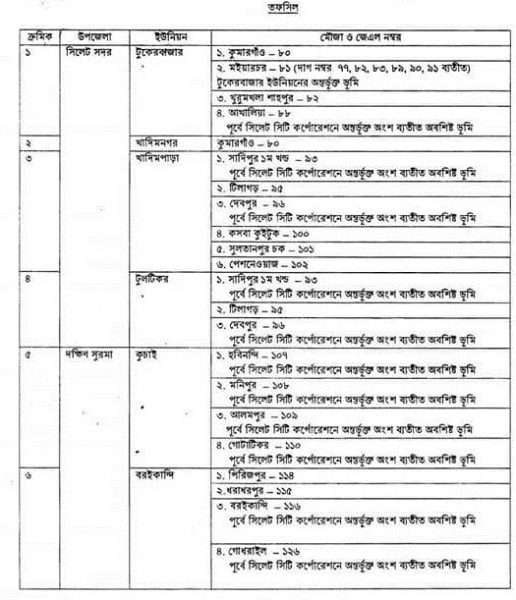 গণবিজ্ঞপ্তিতে বলা হয়, সিলেট সিটি কর্পোরেশন এলাকা সম্প্রসারণের নিমিত্তে সিলেট সদর ও দক্ষিণ সুরমা উপজেলার নিন্মোক্ত এলাকা/ভূমি প্রাথমিকভাবে সিলেট সিটি কর্পোরেশনে অন্তর্ভুক্তির সিদ্ধান্ত গ্রহণ করা হয়েছে। অন্তর্ভুক্তি এলাকার অধিবাসীগণকে সিলেট সিটি কর্পোরেশনের আওতাভুক্তের প্রাথমিক সিদ্ধান্তের বিষয়ে কোন ধরণের পরামর্শ বা আপত্তি থাকলে আগামী ৮ সেপ্টেম্বরের মধ্যে জেলা প্রশাসক, সিলেট বরাবর লিখিত আবেদনের মাধ্যমে জানানোর অনুরোধ করা হলো।