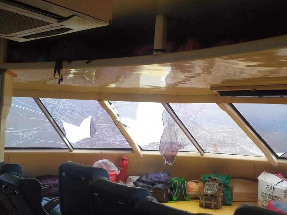 ঢাকা টু ইলিশা, ঢাকা থেকে ছেড়ে যাওয়া গ্রীন লাইন এর ইলিশা লঞ্চটি নদীর মাঝখানে অবস্থান রত অবস্থায় ঝড়ের কবলে পড়ে। বাতাসের গতি বেশি থাকায় লঞ্চটির বেশ কিছু গ্লাস ভেঙ্গে যায়। তিনজন আহত হয়েছে বলে সূত্রে জানা যায়।