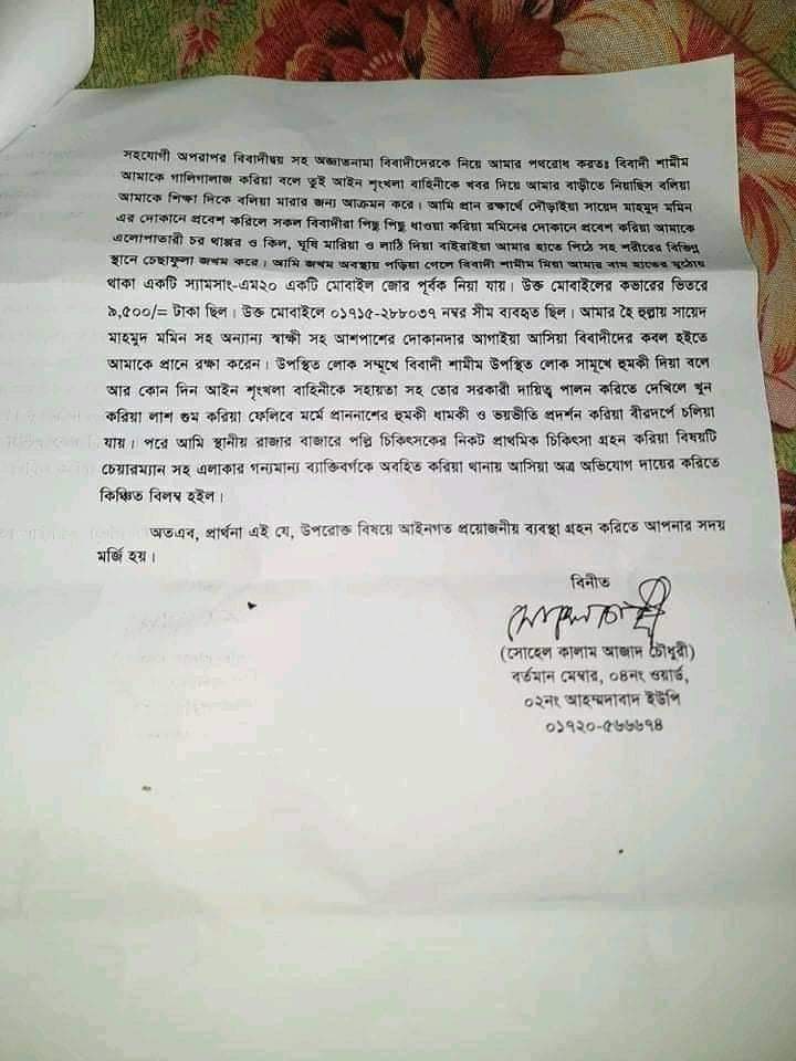 এ ব্যাপারে আহম্মদাবাদ ইউপি চেয়ারম্যান সনজু চৌধুরী বলেন, একজন ইউপি সদস্যের ওপর হামলার ঘটনা খুবই নেক্কারজনক। তিনি এ ঘটনার সুষ্ঠু তদন্ত দাবি করেছেন। সোহেল মেম্বারের উপর হামলাকারী শামীম বলেন, ইউপি সদস্য ক্ষমতার অপব্যবহার করে তার বাড়িতে বিজিবি পাঠিয়েছেন। তিনি মাদক ব্যবসায় জড়িত নয় বলে দাবি করেন। চুনারুঘাট থানার দায়িত্বপ্রাপ্ত পুলিশ কর্মকর্তা চম্পক দাম বলেন, ইউপি সদস্যের ওপর হামলার ঘটনায় থানায় এজাহার দায়ের করা হয়েছে। পুলিশ তদন্ত সাপেক্ষে ব্যবস্থা গ্রহণ করবে।