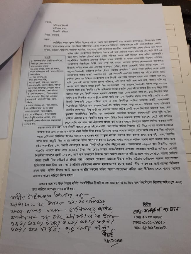 একপর্যায়ে কথা কাটাকাটি শেষে নিয়ে যাওয়া হয় তাদের ধোয়া পাড়া হিন্দু বাড়িতে প্রকাশ নেছার এর বাগান বাড়িতে। ২৩-৯-২০২০ ইংরেজী তারিখ সকাল বেলা ৭ ঘটিকার সময়। ভিকটিম কামরুল হাসান এর কাছে জানতে চাইলে তিনি আরোও বলেন, আসামি তার বাগান বাড়িতে নিয়ে একটি রুমে প্রথম পিস্তল দিয়ে গুলি করতে চেয়েছিলো ফায়ার না হওয়ার কারণে সে পিস্তল এর বাট দিয়ে এলোপাতাড়ি মাথায় ও শরীরে আঘাত করে এবং তার মামা সোহাগ ছুরি দিয়ে এলোপাতাড়ি শরীরে মারতে থাকে, একপর্যায়ে আমার হাতের বৃদ্ধা আঙ্গুল কেটে যায় এবং বাম হাতের বাহুতে কয়েকটা মারাত্বক জখম করে। তখন মাটিতে লুটে পরে যায়।
