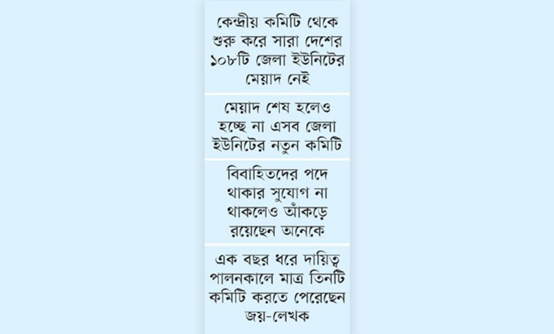 সূত্র জানায়, মেয়াদ শেষ হলেও জেলা কমিটির সম্মেলন বা নতুন কমিটি গঠিত না হওয়ায় তৃণমূল ছাত্রলীগে দেখা দিয়েছে হতাশা। বিবাহিত ও বয়স্করা শীর্ষ পদ আঁকড়ে ধরে থাকায় নতুনরা জায়গা পাচ্ছে না। সক্রিয়রা পদ পেতে দৌড়ঝাঁপ করেও কোনো কাজ হচ্ছে না। আধিপত্য বিস্তার নিয়ে প্রায় সংঘর্ষ বা হানাহানির ঘটনাও ঘটছে। কেন্দ্রীয় নির্বাহী সংসদের সভাপতি ও সাধারণ সম্পাদকের কাছে নতুন কমিটির বিষয়ে ধরনা দিলেও কোনো কাজে আসছে না।