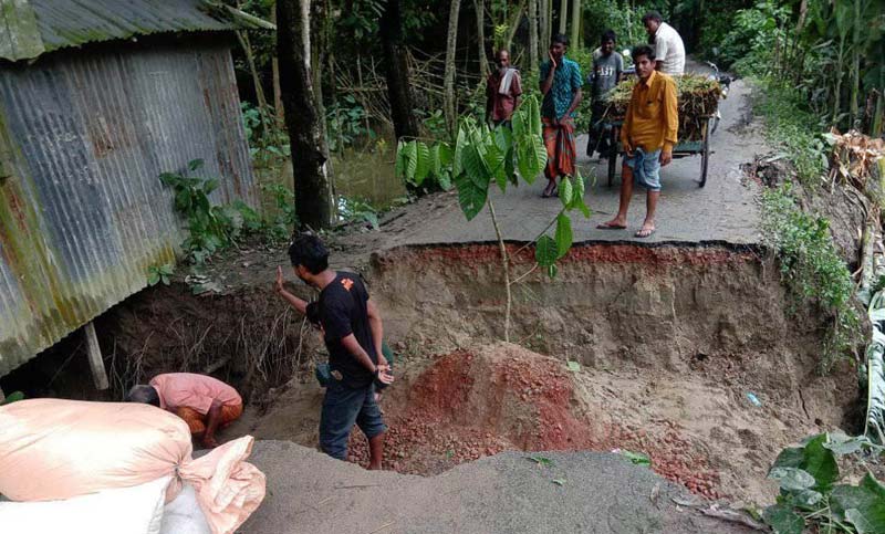 বগুড়ার ধুনট উপজেলায় পেঁচিবাড়ি-চাঁনদিয়াড় পাকা সড়ক ভেঙে দ্বিখণ্ডিত হওয়ায় যোগাযোগ বিচ্ছিন্ন হয়ে পড়েছে। প্রবল বর্ষণে বৃহস্পতিবার সকালের দিকে ওই সড়কের প্রায় ৫ মিটার অংশ ভেঙে পাশের খালে বিলীন হয়েছে। ফলে দুর্ভোগে পড়েছেন এলাকার কমপক্ষে অর্ধশত গ্রামের মানুষ।