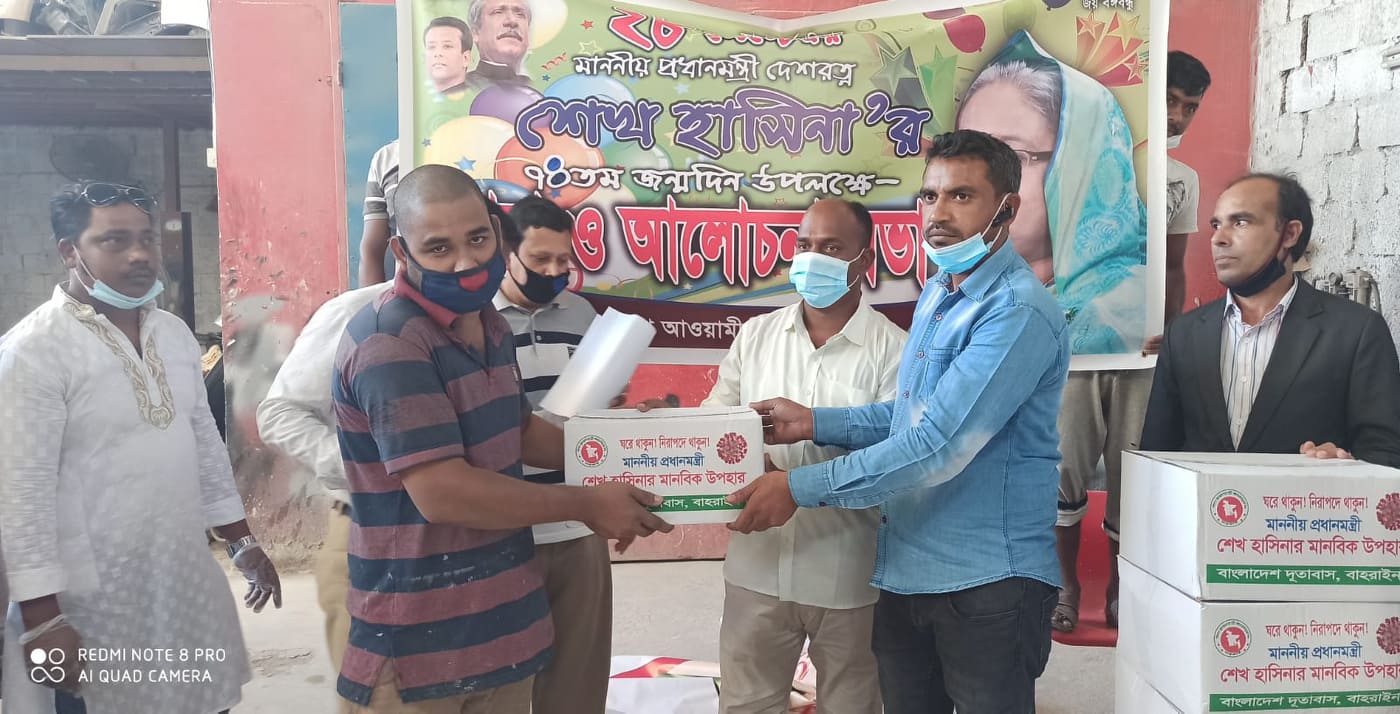 বাহরাইনে কর্মহীন প্রবাসী শ্রমিকদের মাঝে প্রধানমন্ত্রী শেখ হাসিনার পক্ষ থেকে উপহার সামগ্রী পৌঁছে দেন বাংলাদেশ আওয়ামী লীগ বাহরাইন কেন্দ্রীয় কমিটি এবং বাহরাইন সরকার কর্তৃক অনুমোদিত সামাজিক সংগঠন বাংলাদেশ সমাজ(৯ অক্টোবর) দেশটির রাজধানী মানামায় বাংলাদেশ সমাজের কার্যালয়ে এবং দেশটির হামাদ টাউন এলাকায় কর্মহীন হয়ে পড়া প্রবাসী কর্মীদের হাতে এ ফুড বাস্কেট তুলে দেয়া হয়।এ সময় বাংলাদেশ দূতাবাসের পক্ষ থেকে উপস্থিত ছিলেন মোহাম্মদ আইয়ুব আলী।বাংলাদেশ আওয়ামী লীগ বাহরাইন কেন্দ্রীয় কমিটির সভাপতি মনজুর আহমদ। বাংলাদেশ আওয়ামী লীগ বাহরাইন কেন্দ্রীয় কমিটির সাধারণ সম্পাদক এম এ হাশেম। আব্দুল সাত্তার। কালাম দেওয়ান। আব্দুল মতিন বৃহত্তর ফরিদপুর জেলা কল্যাণ পরিষদের সভাপতি সেলিম দড়ি সহ সংগঠনের নেতৃবৃন্দ।বক্তারা বলেন প্রধানমন্ত্রী শেখ হাসিনার ঘোষণা অনুযায়ী দেশ বিদেশে কোনো মানুষই না খেয়ে থাকবে না। সেই ঘোষণা বাস্তবায়নের জন্যই বাহরাইনে অসহায় প্রবাসীদের মাঝে মাননীয় প্রধানমন্ত্রীর উপহার তুলে দেয়া হলো এবং আগামীতে এ সহযোগিতা অব্যাহত থাকবে।