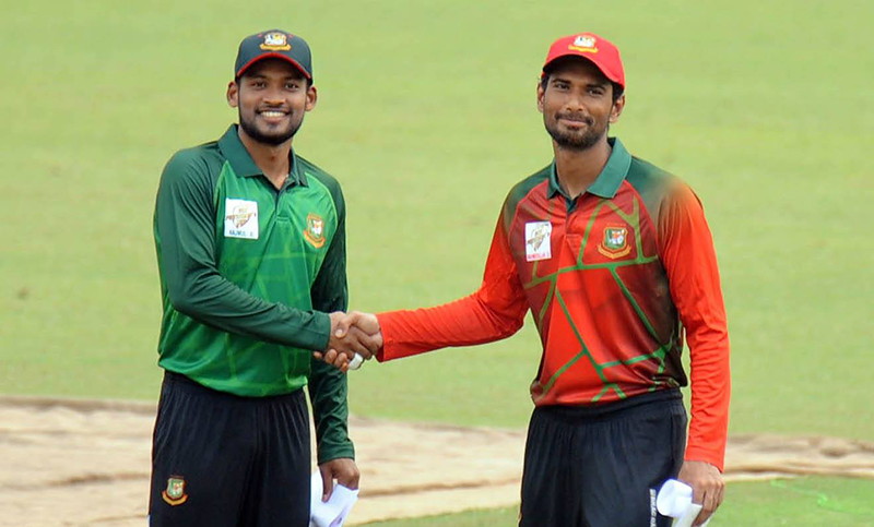 এর আগে মেঘলা আকাশের কারণে যথাসময়ে টস হওয়া নিয়ে শঙ্কা দেখা দেয়। কয়েক মিনিট দেরিতে হলেও টস অনুষ্ঠিত হয়। টস জিতে নাজমুল হোসেন শান্ত তার ‘বড় ভাই’ মাহমুদউল্লাহ রিয়াদের দলকে ব্যাটিংয়ে আমন্ত্রণ জানান। মাহমুদউল্লাহ একাদশ ৩ ওভার ব্যাটিং করতেই ঝিরিঝিরি বৃষ্টিতে খেলা বন্ধ হয়ে যায়। কোনো উইকেট না হারিয়ে তাদের ১৭ রান। নাইম শেখ ৯ ও লিটন দাস ৭ রানে অপরাজিত আছেন।