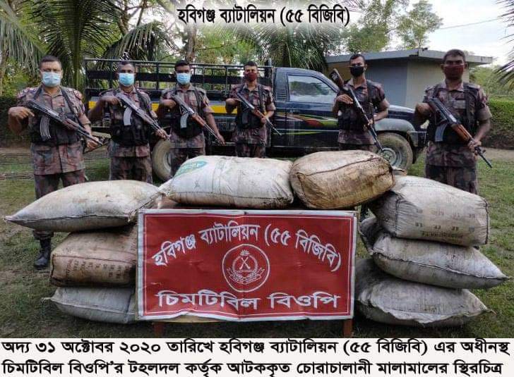 বিজিবি ৫৫ ব্যাটালিয়নের অধিনায়ক লেফটেন্যান্ট কর্নেল সামিউন্নবী চৌধুরী পিবিজিএম, পিবিজিএমএস জানান, ৩১ আগস্ট ভোর চারটায় উপজেলার সীমান্তবর্তী এলাকা মেইন পিলার ১৯৭১ থেকে আনুমানিক সাড়ে সাত কিলোমিটার বাংলাদেশ অভ্যন্তরে আমতলী নামক স্থানে অভিযান চালায় বিজিবি চিমটিবিল বিওপির একদল জোয়ান। এ সময় তারা ধাওয়া করলে মিনি ট্রাক ড্রাইভার ট্রাক ফেলে পালিয়ে যায়। পরে তারা পরিত্যক্ত অবস্থায় ভারতীয় চা পাতা উদ্ধার করেন। আটককৃত ৯০০ কেজি চা পাতা ও মিনি ট্রাক এর সীজার মূল্য ১০ লক্ষ ৭০ হাজার টাকা। এ রিপোর্ট লেখা পর্যন্ত আটককৃত মালামালের আইনি প্রক্রিয়া চলছিল।