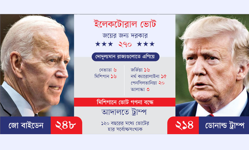 ভোটের হিসাব রাজ্যে রাজ্যে : নির্বাচনের আগে প্রায় সব জাতীয় জরিপে এগিয়ে ছিলেন বারাক ওবামার ‘দক্ষিণ হস্ত’ জো বাইডেন। তবে সেসব জরিপেও উঠে এসেছিল দোদুল্যমান রাজ্যগুলোতে হাড্ডাহাড্ডি লড়াইয়ের আভাস। জরিপগুলোর প্রথমাংশের ধারণা কতটা মিলেছে এখনো স্পষ্ট নয়, তবে দ্বিতীয় অংশ যে পুরোপুরি মিলে গেছে তা দৃশ্যমান। দিনের সেরা উপহার হিসেবে ফ্লোরিডা ও ওহাইওকে পকেটে পুরেছেন ট্রাম্প। এদিক থেকে বাইডেনের অর্জনটি হলো আরিজোনা। ২৪ বছর পর কোনো ডেমোক্র্যাট প্রার্থী প্রথম এ রাজ্যে জয় পেল। এখনো এগিয়ে আছেন মিশিগান ও নেভাডা। এরই মধ্যে ঝোলায় পুরেছেন নিউ ইয়র্ক, ওয়াশিংটন ডিসি, উইসকনসিন, কানেকটিকাটসহ ২০টি রাজ্যের ইলেকটোরাল ভোট।