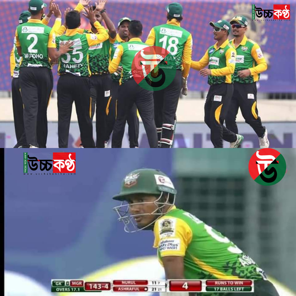 এরপর উইকেটে আসেন মোহাম্মদ আশরাফুল। ১১তম ওভারের প্রথম বলে ছক্কা হাঁকিয়ে নাজমুল শান্ত নিজের ফিফটি পূরণ করেন। একই ওভারে ৩৪ বলে ৬ চার ৩ ছক্কায় ৫৫ রান করা শান্তকে প্যাভিলিয়নে ফেরত পাঠান রিশাদ হোসেন। এরপর ফজলে রাব্বি নেমে শুরু থেকেই হাত খুলে খেলতে থাকেন। দলীয় ১২০ রানের মাথায় আউট হওয়ার আগে ১৬ বলে ২টি করে চার-ছক্কায় করেন ২৪ রান। শামীম পাটোয়ারিকে বাউন্ডারি মেরে দলের জয় নিশ্চিত করেন ২২ বলে ২৫* রান করা