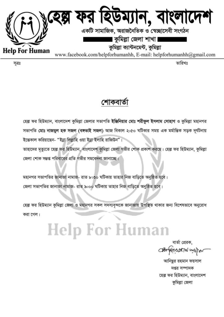 না ফেরার দেশে চলে গেলেন কুমিল্লা জেলার দুই তরুণ নেতা ‘হেল্প ফর হিউম্যান’ কুমিল্লা জেলা প্রেসিডেন্ট ‘শরিফুল ইসলাম সোহাগ’