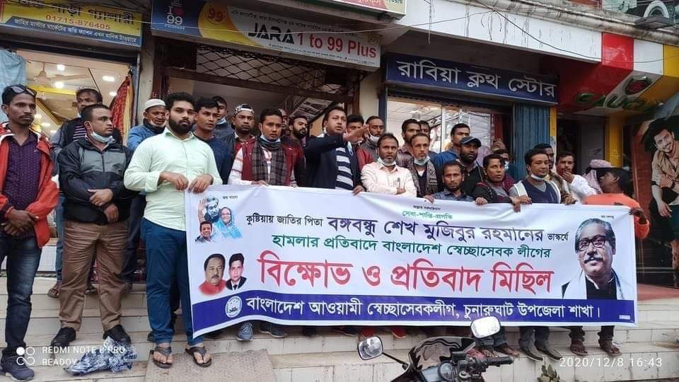 ৮(ডিসেম্বর) বিকালে চুনারুঘাট উপজেলা স্বেচ্ছাসেবকলীগের নেতাকর্মীরা মৌলবাদ,অগ্রবাদি ও বঙ্গবন্ধু শেখ মুজিবুর রহমানের ভাস্কর্য ভাঙার বিরুদ্ধে বিক্ষোভ মিছিল করে।