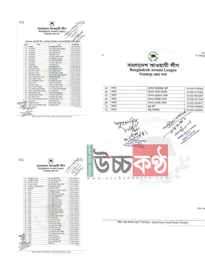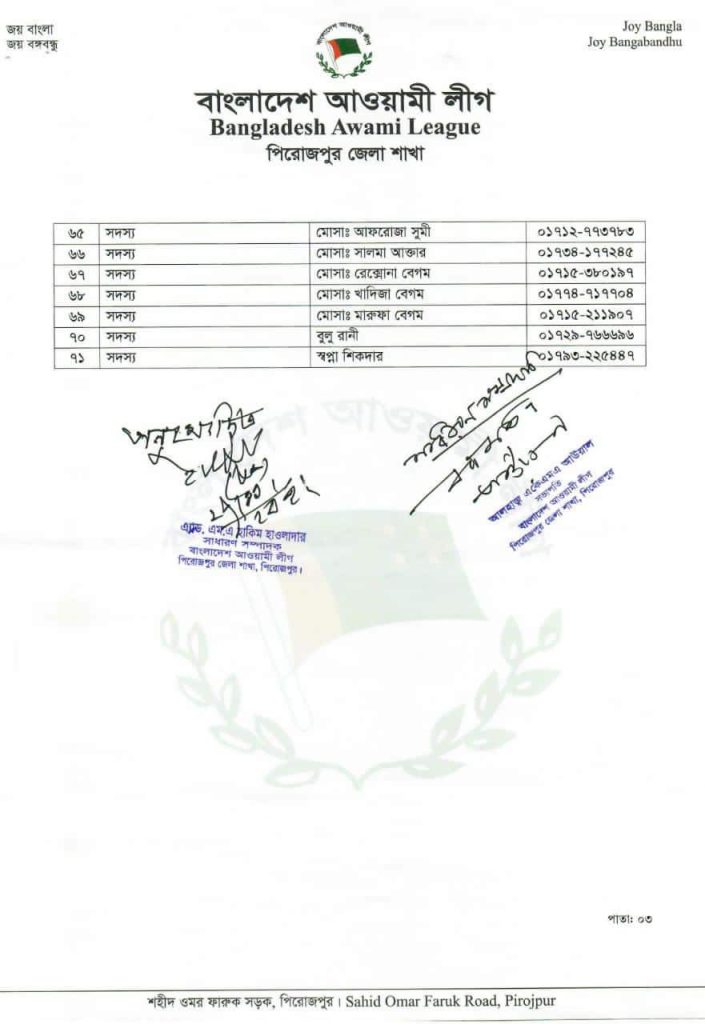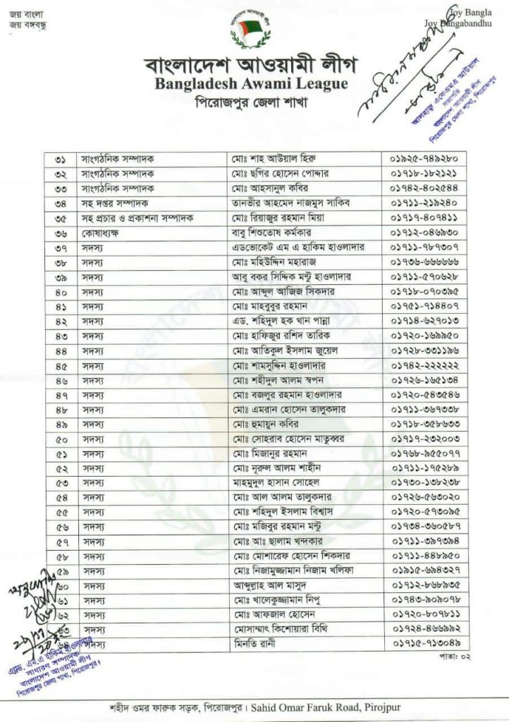 পূর্ণাঙ্গ কার্যনির্বাহী কমিটিতে সহ-সভাপতি পদে মোঃ লিয়াকত হোসেন তালুকদার, নেজামুল হক নান্না,মোঃ আব্দুর রশিদ মৃধা, বাবু বিরেন্দ্র নাথ বসু,মোঃ হুমায়ন কবির হাওলাদার, মোঃ সাহাবুদ্দিন শাহ্ বাবুল,মোঃ নুরুল আহসান মিলটন,খান এনামুল করিম পান্না, বাবু কিরন চন্দ্র বসু ও যুগ্ম সাধারণ সম্পাদক পদে কাজী রোকনুজ্জামান বশীর, এম এ রাজ্জাক ফারুক,মোঃ জাকির হোসেন বেপারী সহ বিভিন্ন পদে মোট ৭১ সদস্যের কমিটি ঘোষণা করা হয়।