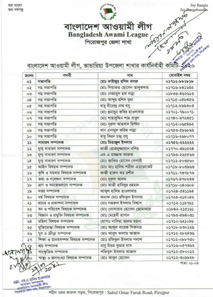 সম্মেলন শেষে প্রায় ৯ মাস পর গত ২৭ নভেম্বর পিরোজপুর জেলা আওয়ামী লীগের সভাপতি আলহাজ এ,কে,এম,এ আউয়াল ও সাধারণ সম্পাদক এ্যাড. এমএ হাকিম হাওলাদার স্বাক্ষরিত এক বিজ্ঞপ্তিতে ভাণ্ডারিয়া উপজেলা আওয়ামী লীগের পূর্নাঙ্গ কমিটি ঘোষণা করা হয়।