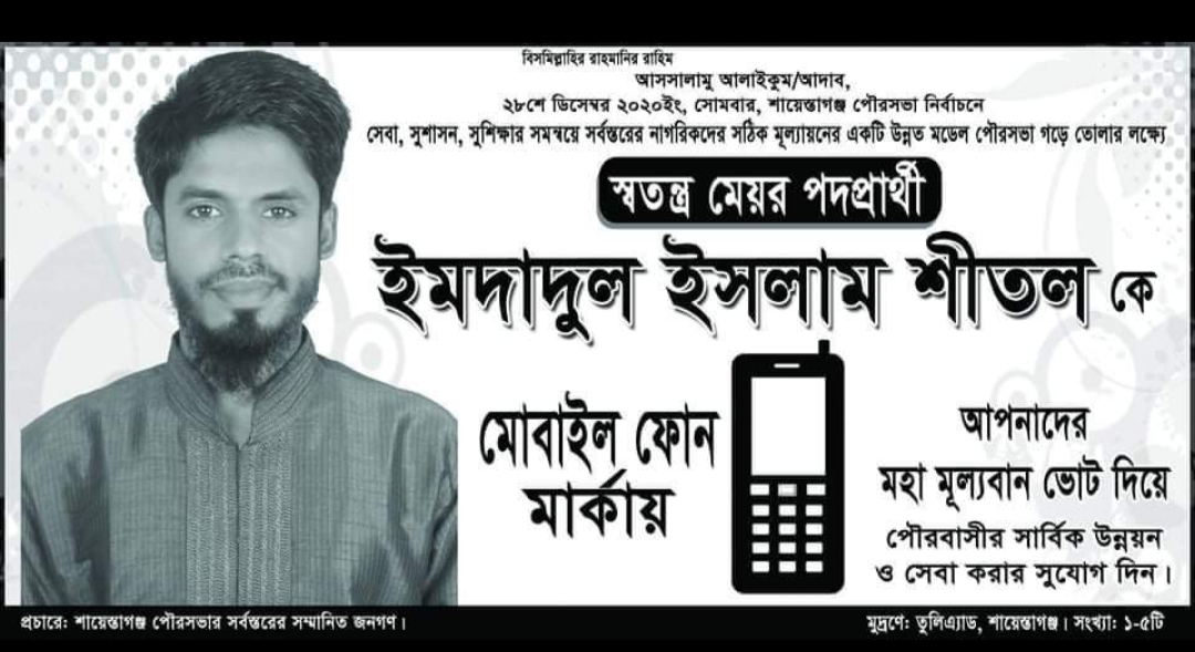 প্রথম ধাপে অনুষ্টিত সারাদেশের ২৫ টি পৌরসভা নির্বাচনে সবচেয়ে কম বয়সী মেয়র প্রার্থী হিসেবে হবিগঞ্জ জেলার শায়েস্তাগঞ্জ পৌরসভায় প্রতিদ্বন্দ্বীতা করছেন স্বতন্ত্র মেয়র প্রার্থী ইমদাদুল ইসলাম ইসলাম শীতল।তার নির্বাচনি প্রতিক মোবাইল ফোন।পৌরসভার প্রতিটি ওয়ার্ডের তরুণদের স্বতঃস্ফুর্ত সহযোগীতার মাধ্যমে ব্যাপক আলোচনায় এই প্রার্থী।