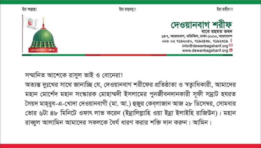 রাজধানী মতিঝিলে অবস্থিতদেওয়ানবাগ দরবার শরীফের প্রতিষ্ঠাতা ও স্বত্বাধিকারী সৈয়দ মাহবুব-এ-খোদা দেওয়ানবাগী ইন্তেকাল করেছেন (ইন্নালিল্লাহি ওয়া ইন্না ইলাইহি রাজিউন)। সোমবার (২৮ ডিসেম্বর) ভোর ৬টা ৪৮ মিনিটে তিনি ইন্তেকাল করেন। মৃত্যুকালে তার বয়স হয়েছিল ৭০ বছর।