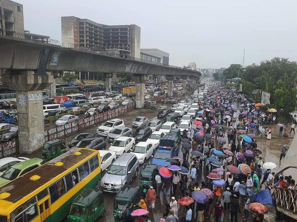 ট্রাফিক পুলিশ জানায়, বৃষ্টিতে বিভিন্ন জায়গা পানি জমে যাওয়া এবং বিআরটি প্রকল্পের কাজের কারণেই বিমানবন্দর সড়কে তীব্র জটের সৃষ্টি হয়েছে।