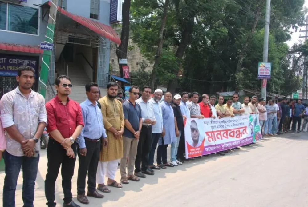দৈনিক কুমিল্লার কাগজের দেবিদ্বার প্রতিনিধি শাহীন আলমের উপর সন্ত্রাসী হামলার প্রতিবাদে এবং জড়িতদের আইনের আওতায় আনার দাবিতে মানববন্ধন ও প্রতিবাদ সমাবেশ করেছেন সাংবাদিকরা। সোমবার সকাল সাড়ে ১০ টায় কুমিল্লায় কর্মরত সাংবাদিকদের ব্যানারে কুমিল্লা প্রেসক্লাবের সামনে এ কর্মসুচি পালিত হয়।