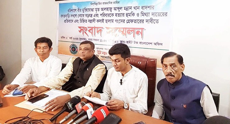 সংবাদ সম্মেলন রাইট টক বাংলাদেশ এর প্রতিষ্ঠাতা ও সভাপতি বলেন,বরিশাল সিটি করপোরেশনের রুপাতলী খালেদাবাদ কলোনীর ১৩ নং ওয়ার্ডের চিহ্নিত সন্ত্রাসী একাধিক মামলার আসামি ছালাম কসাই, ইমরান হোসেন ও রকি বায়েজিদসহ কিছু অসাধু লোকজন বিভিন্ন সময়ে বীরমুক্তিযোদ্ধা মৃত আলহাজ্ব আব্দুল মন্নান খানের বসতবাড়ি দখলে নেয়ার চেষ্টা করছে এবং মুক্তিযোদ্ধা পরিবারের নামে মিথ্যা মামলা দায়ের করে হয়রানির পাশাপাশি হত্যার হুমকি দিচ্ছে সন্ত্রাসীরা।