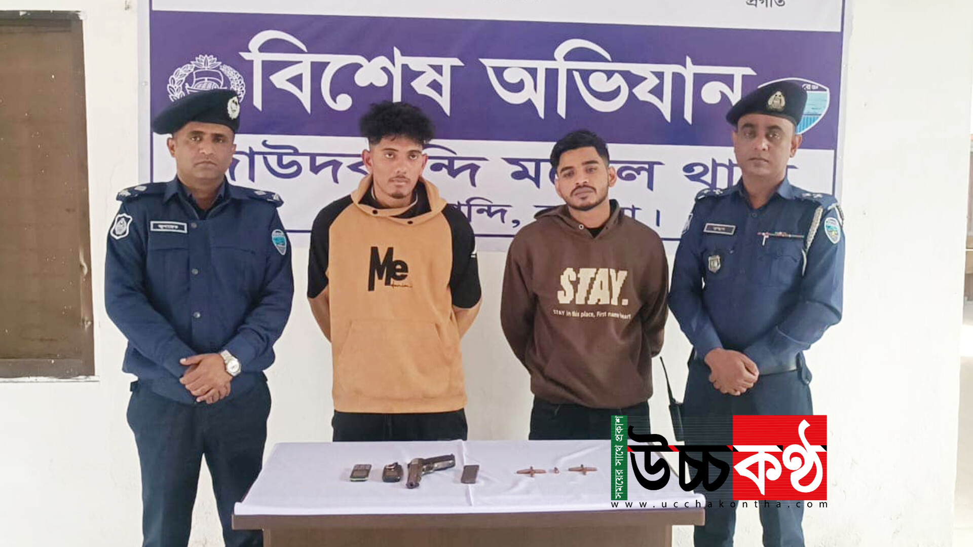 অদ্য ২২/০১/২০২৫ খ্রি: তারিখ রাত ০৩:৩০ ঘটিকায় গোপন সংবাদের ভিত্তিতে দাউদকান্দি মডেল থানায় কর্মরত এসআই আব্দুল কুদ্দুস জানতে পারেন যে মোটর সাইকেলে দুই তরুন অস্ত্র সহ ঘুরাফেরা করছে।এইসময় দাউদকান্দি মডেল থানায় সঙ্গীয় ফোর্সসহ থানা এলাকায় রাত্রীকালীন বিশেষ অভিযান ডিউটি করাকালে দাউদকান্দি মডেল থানার গৌরীপুর ইউনিয়নের আঙ্গাউড়া ভুলিরপাড়ে দাউদকান্দি মডেল থানায় অফিসার ইনচার্জ মো. জুনায়েত চৌধুরী নেতৃত্বে বিশেষ অভিযান পরিচালনা করে মোটরসাইকেলে থাকা দুই তরুণকে তল্লাশী করে একটি ৭.৬২ পিস্তল, ৯ রাউন্ড গুলি, ১ টি নাম্বার বিহীন মোটর সাইকেল উদ্ধারপূর্বক ০২ জন আসামী গ্রেফতার করা হয় । আসামীদ্বয় হল ০১। মোঃ ইসহাক তুষার ( ২৪),পিতা:- আলমগীর গ্রাম:- বাশরা,থানা:-দাউদকান্দি ০২। মেহেদী হাসান রাজা (২২), পিতা:- আবুল কাশেম,গ্রাম:-গৌরীপুর, থানা:-দাউদকান্দি