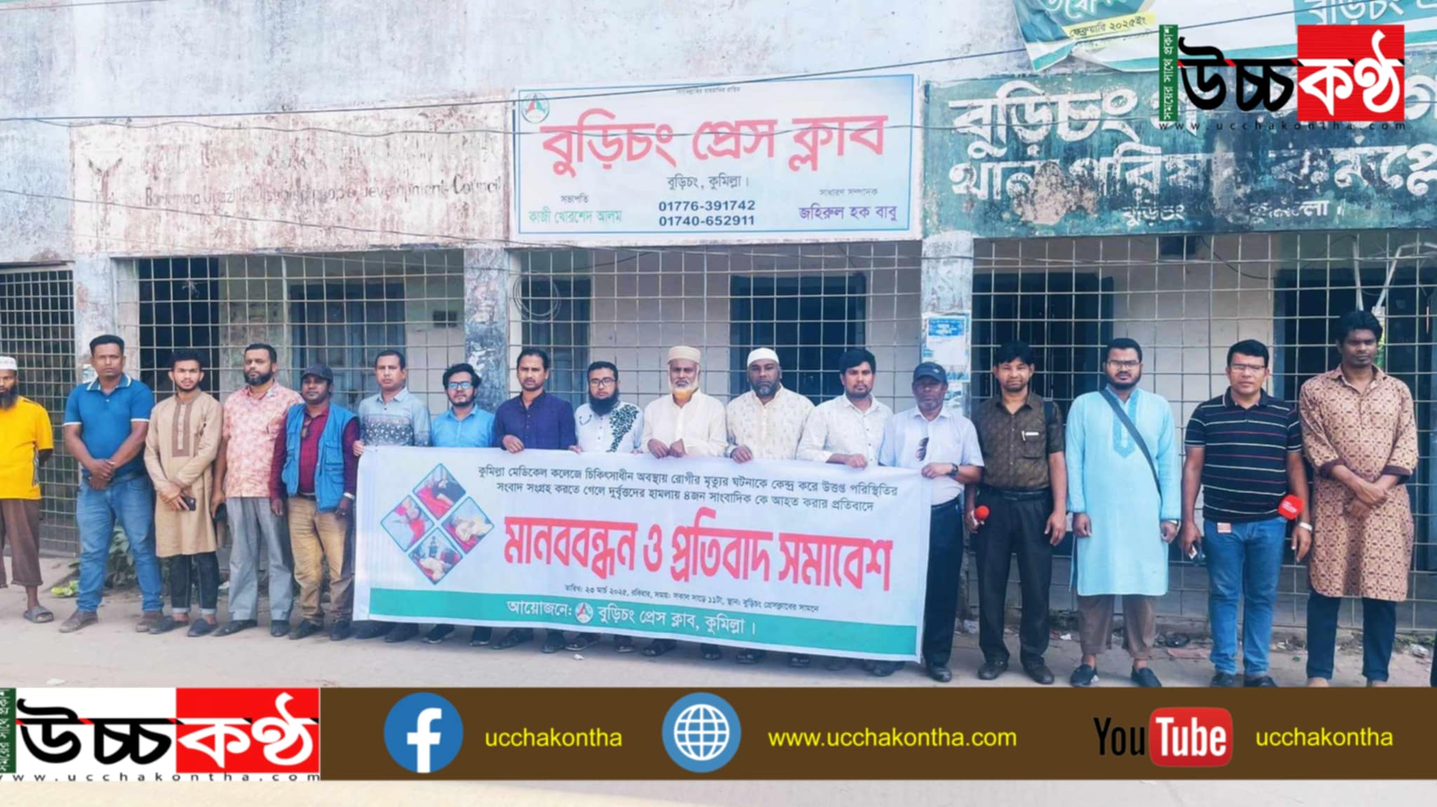 বুড়িচং প্রেস ক্লাবের সভাপতি কাজী খোরশেদ আলমের সভাপতিত্বে ও সাধারণ সম্পাদক জহিরুল হক বাবুর সঞ্চালনায় মানববন্ধন ও বিক্ষোভ অনুষ্ঠানে বক্তব্য রাখেন বুড়িচং প্রেস ক্লাবের উপদেষ্টা আবু মুসা, সাবেক সভাপতি মো. মোসলেহ উদ্দিন, সিনিয়র সহ-সভাপতি গাজী জাহাঙ্গীর আলম জাবির, যুগ্ম সম্পাদক মারুফ কল্প, সাংগঠনিক সম্পাদক মো. জাকির হোসেন, সহ সাংগঠনিক সম্পাদক আক্কাস আল মাহমুদ হৃদয়, দপ্তর সম্পাদক মোঃ শাফি, প্রচার ও প্রকাশনা সম্পাদক শরিফুল ইসলাম সুমন, তথ্য ও প্রযুক্তি বিষয়ক সম্পাদক আব্দুল্লাহ, সদস্য মোঃ জামাল উদ্দিন দুলাল, সদস্য তাজুল ইসলাম, সদস্য মুহাম্মদ রকিবুল হাসান (রনি), সদস্য হাসিবুল ইসলাম সবুজ, সদস্য আশিক ইরান, কিবরিয়াসহ বিভিন্ন পত্রিকা কর্মরত সাংবাদিকবৃন্দ।