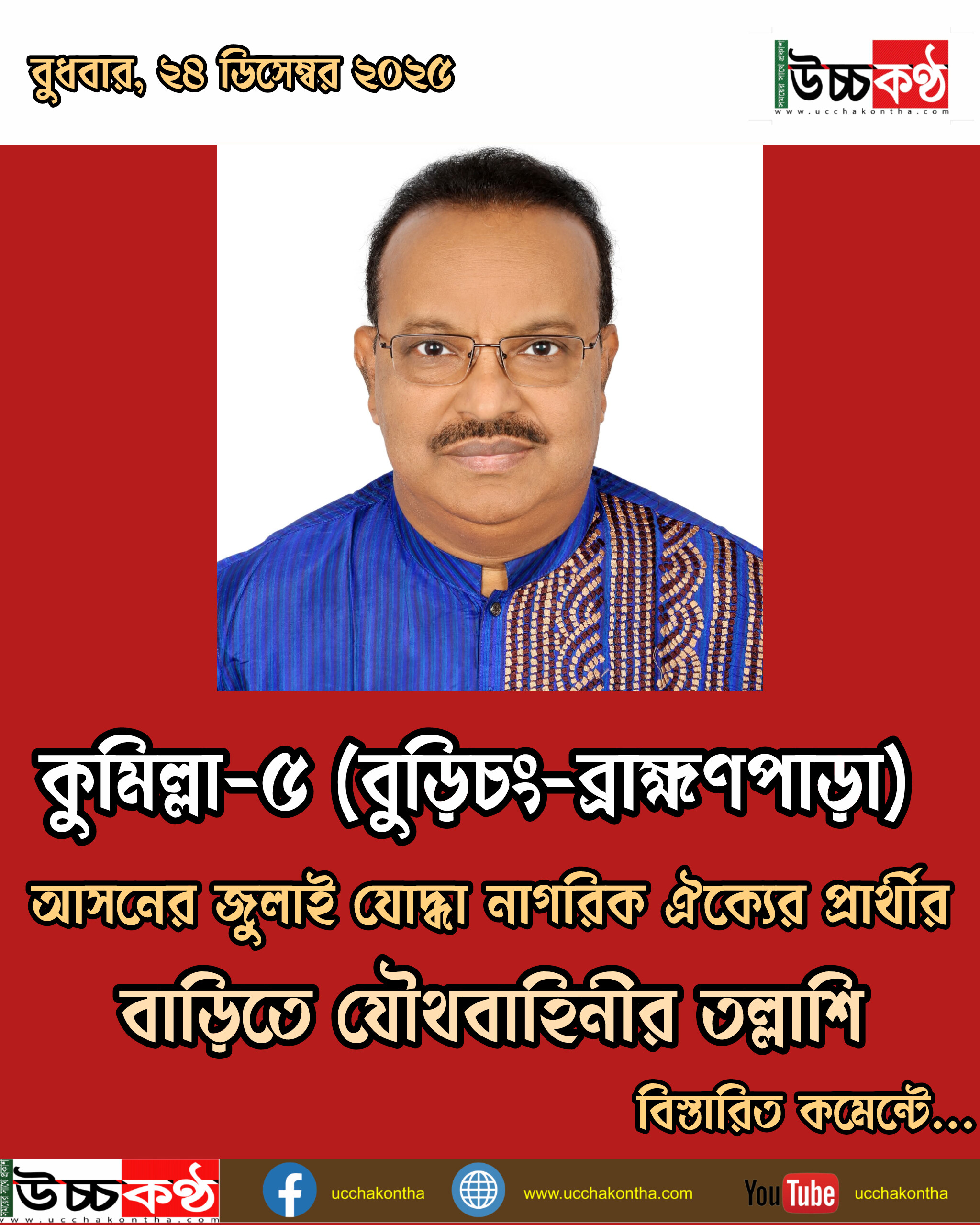 কুমিল্লা-৫ আসনের জুলাই যোদ্ধা নাগরিক ঐক্যের প্রার্থীর বাড়িতে গ্রেপ্তারের উদ্দেশ্যে যৌথবাহিনীর তল্লাশি, না পেয়ে ফিরে যায় দল।