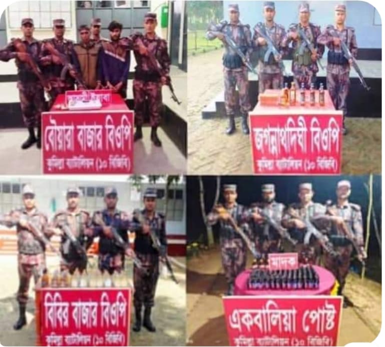 কুমিল্লায় ১০ বিজিবি’র অভিযানে মাদকদ্রব্যসহ আটক-২ প্রেস বিজ্ঞপ্তি: কুমিল্লা ব্যাটালিয়ন (১০ বিজিবি) এর অধীনস্থ বৌয়ারা বাজার বিওপির টহলদল কর্তৃক অভিযান পরিচালনা করে কুমিল্লা জেলার কোতয়ালী উপজেলাধীন সীমান্ত পিলার ২০৮৫/২-এস হতে আনুমানিক ৫০ গজ বাংলাদেশের অভ্যন্তরে ‘হিঙ্গারপাড়’ নামক স্থান হতে ভারতীয় ৫০ টি ইয়াবা ট্যাবলেটসহ দুই জন মাদক চোরাকারবারী লিটন মিয়া (৪০), শফিউল আলম’কে (২৩) আটক করে সদর দক্ষিণ থানায় হস্তান্তর করা হয়েছে। এছাড়াও অন্যান্য বিওপি’র দায়িত্বপূর্ণ এলাকায় অভিযান পরিচালনা করে ভারতীয় ৬১ বোতল মদ, ১০০ বোতল ফেন্সিডিল এবং ২০০০ টি অবৈধ প্যারাকটিন ট্যাবলেট মালিকবিহীন অবস্থায় আটক করা হয়।
